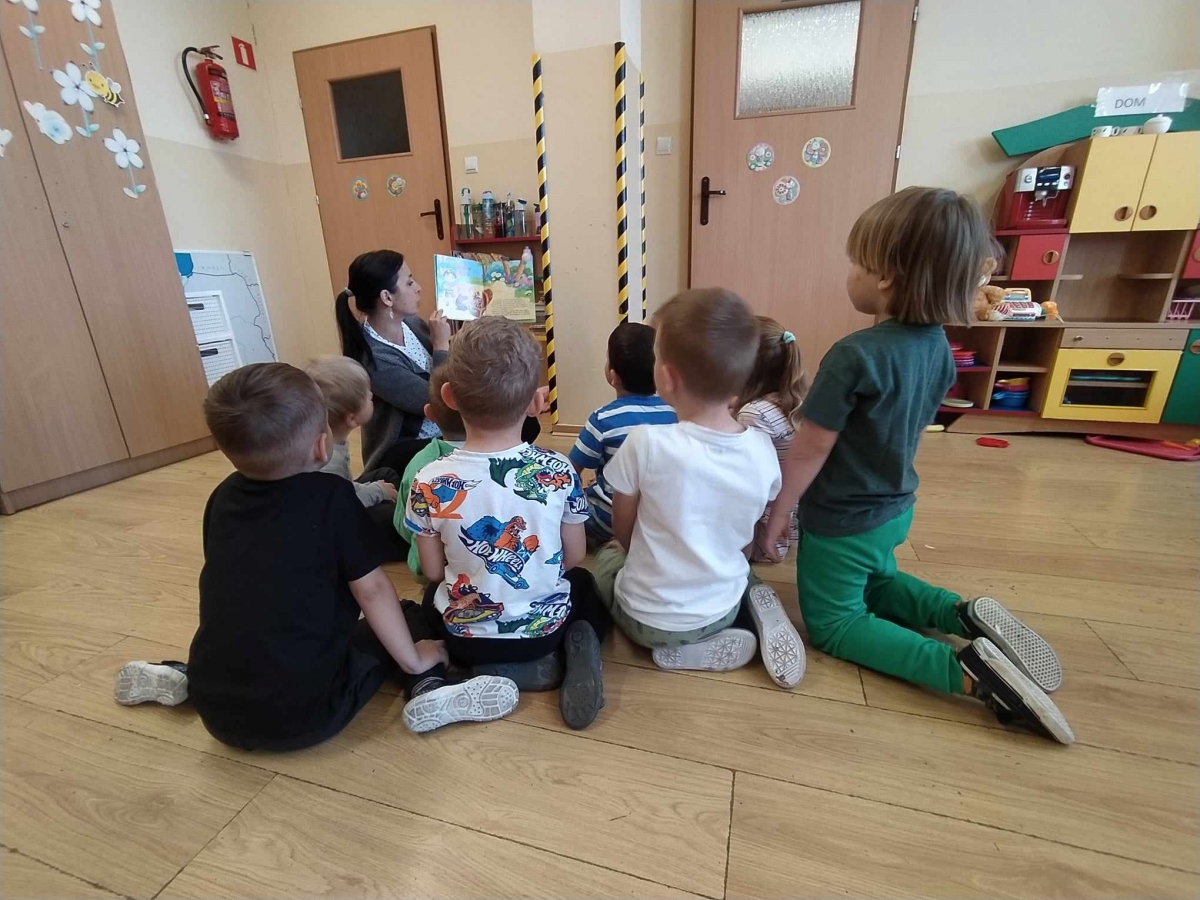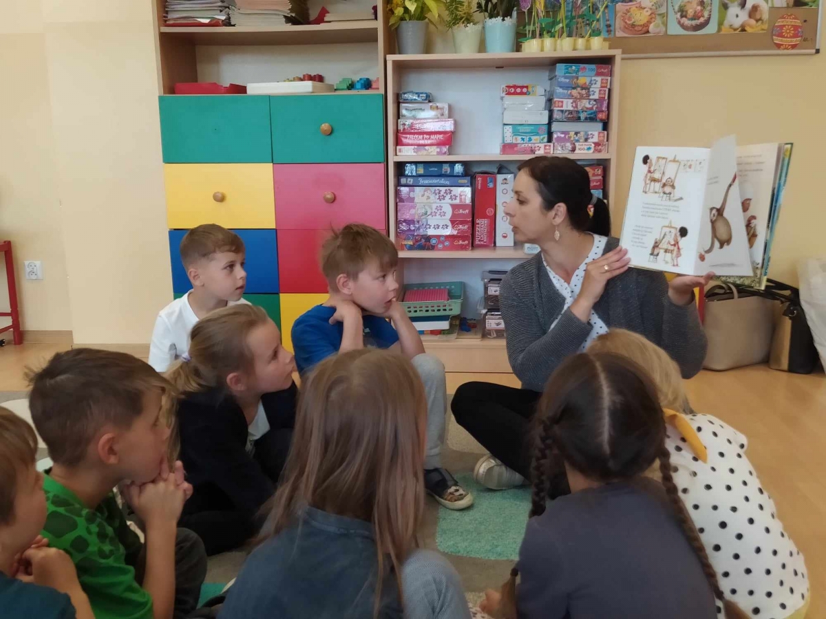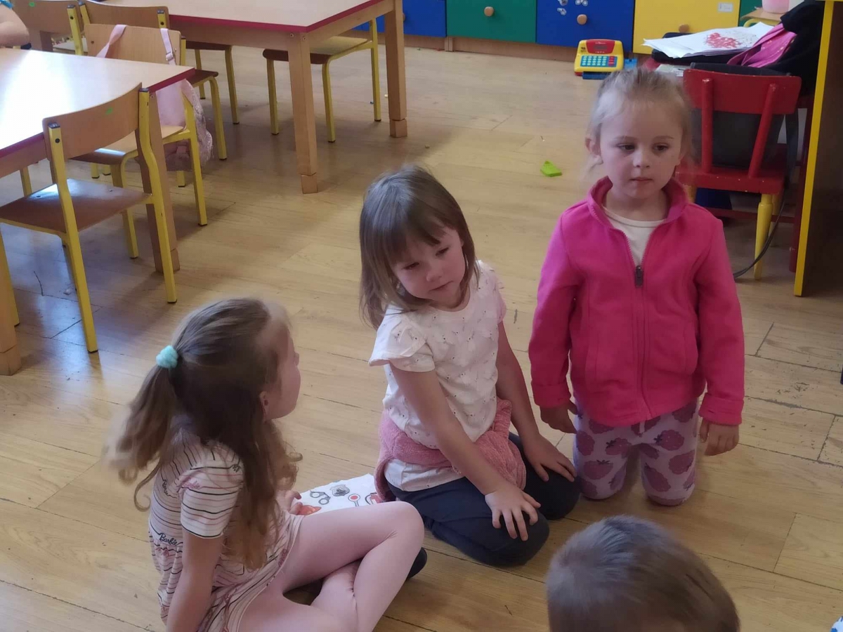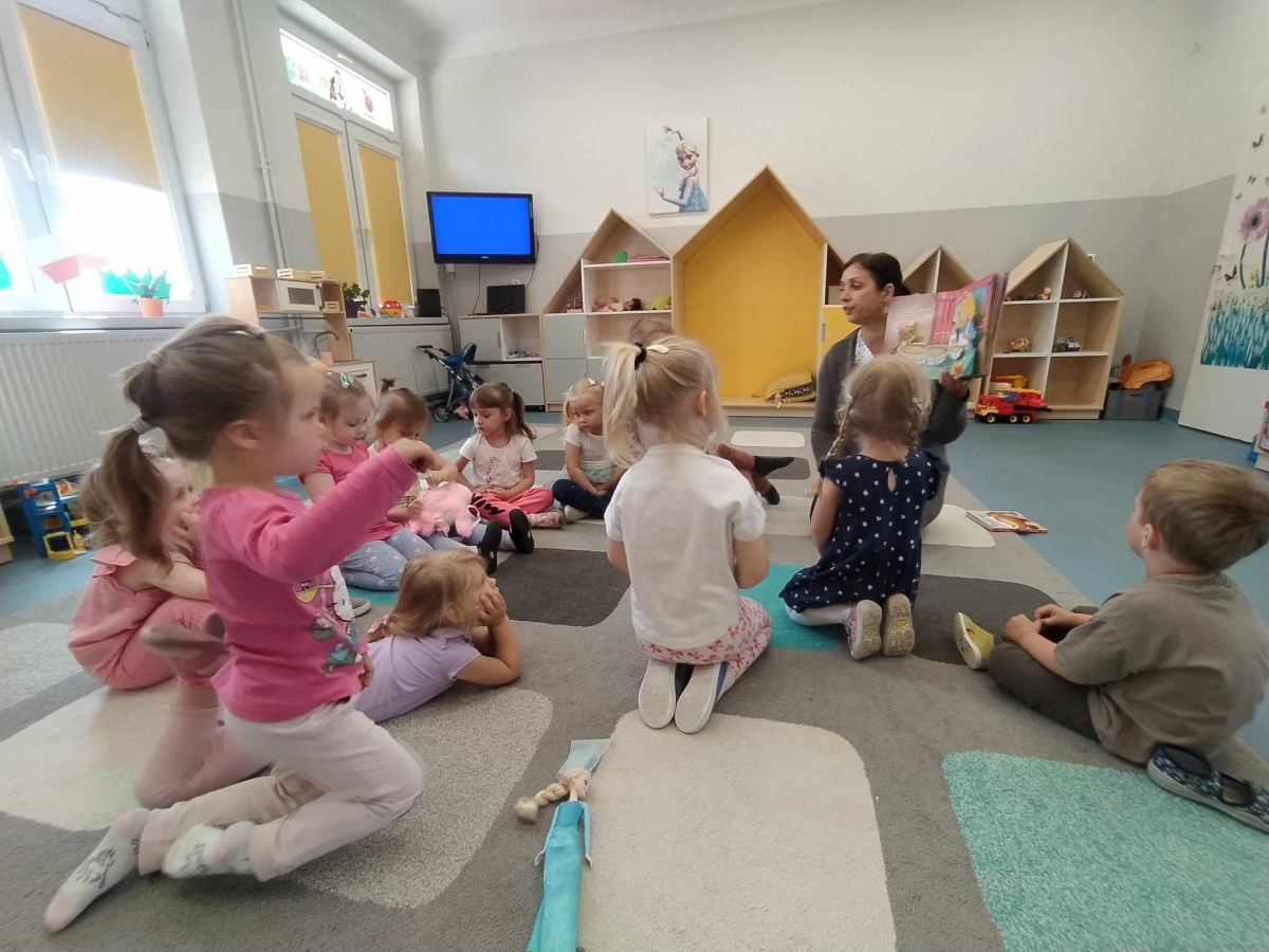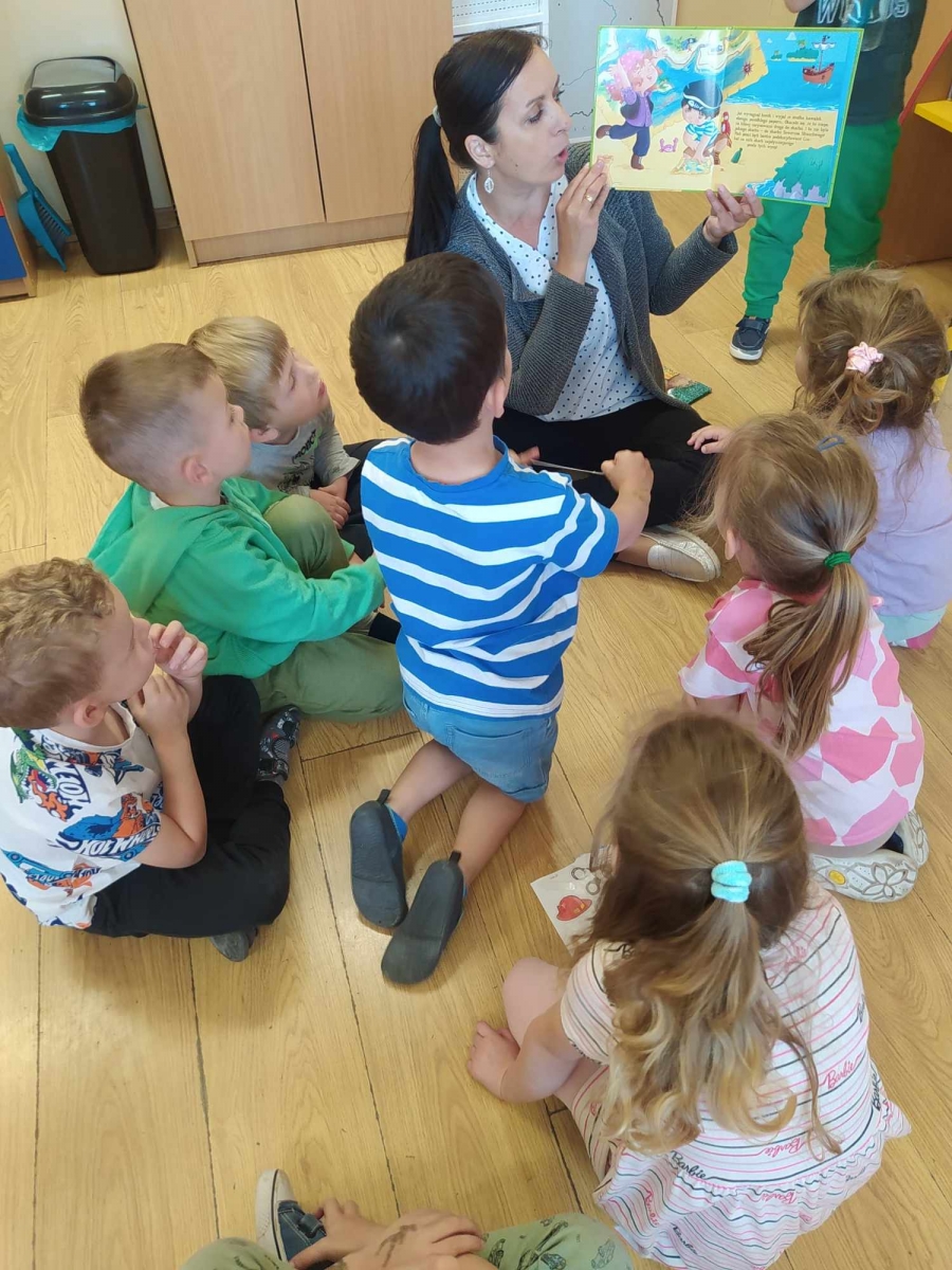 Najmłodszej z grup: „Smerfom” przeczytałam bajkę pt. „Złotowłosa”, w której to ruchome elementy książki wszyscy mogli dotknąć. Następnie zaprezentowałam dzieciom książkę M. Boćko-Mysiorskiej pt. „Tosia i Julek myją zęby”. Najmłodsi chętnie włączyli się do dyskusji opowiadając o swoich szczoteczkach i swoich przygodach związanych z porannym myciem zębów.