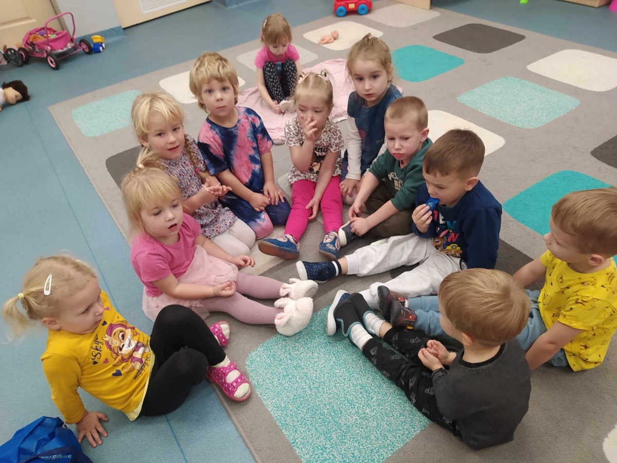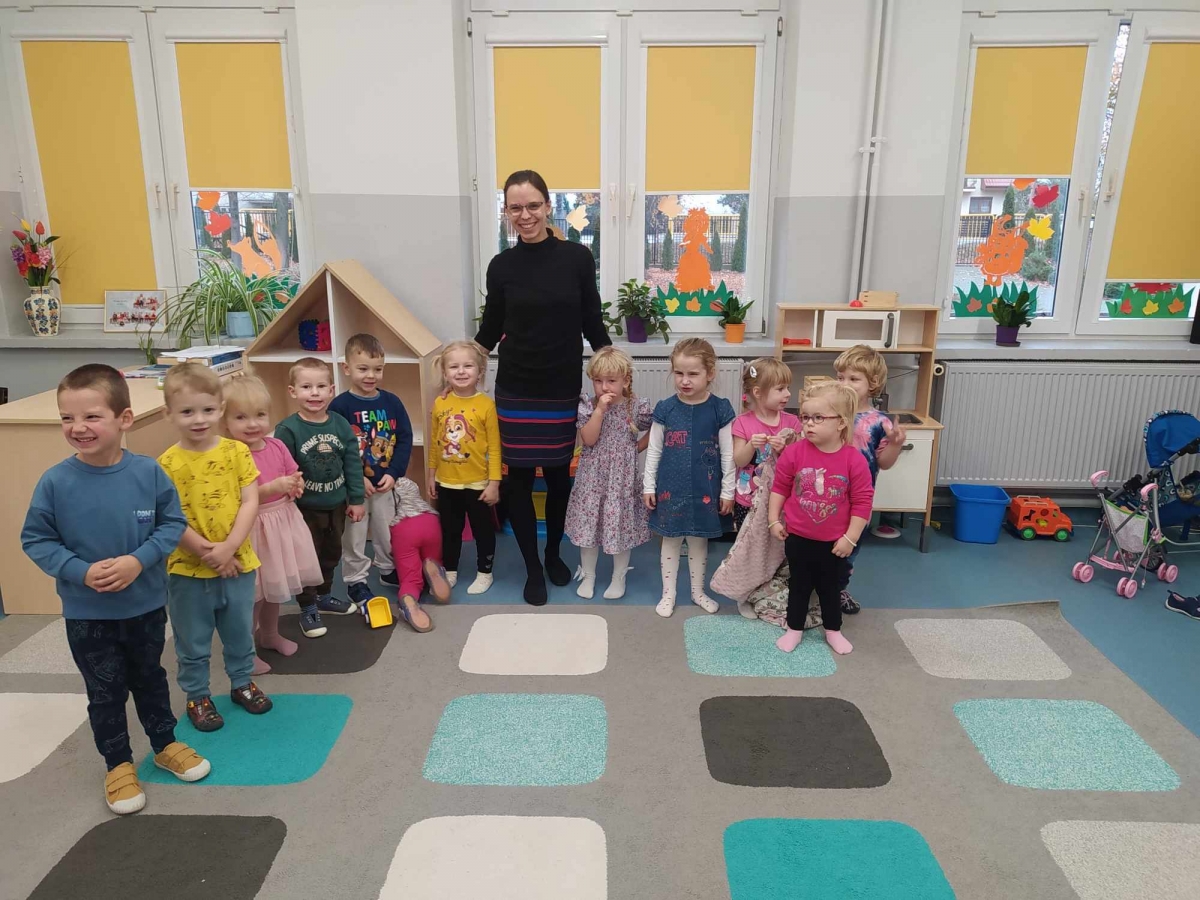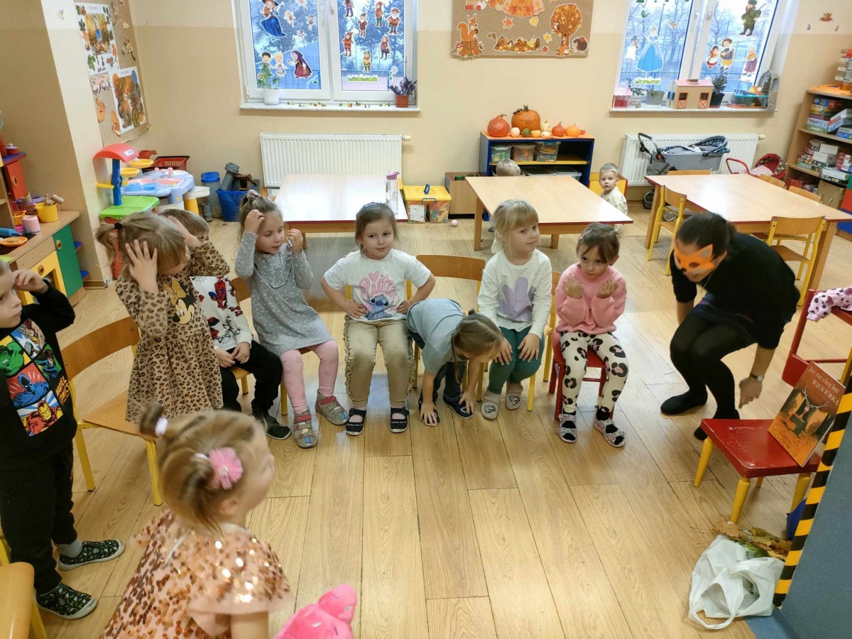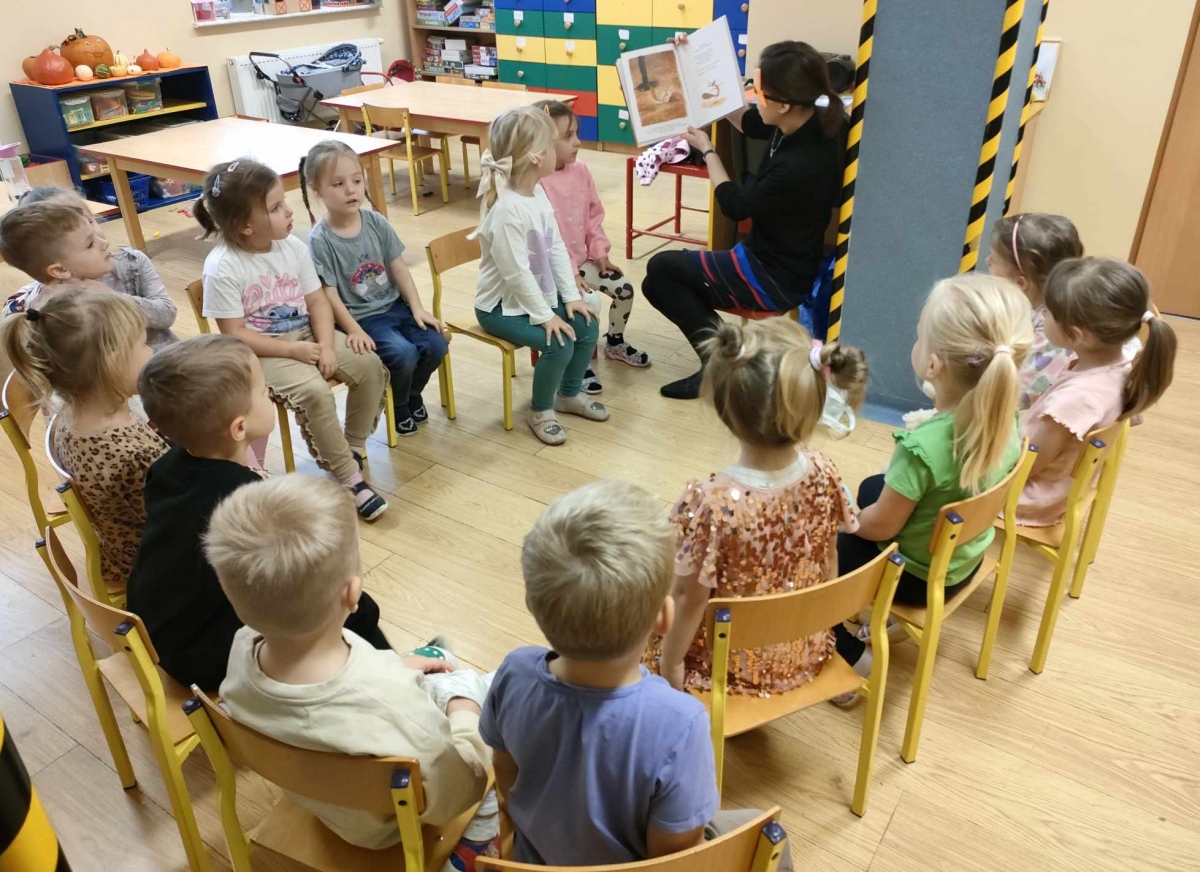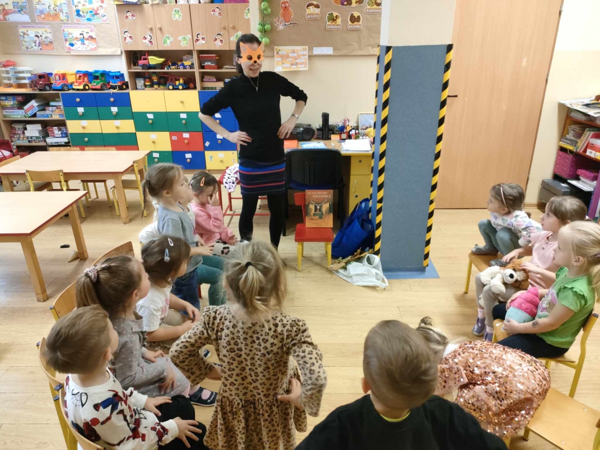 ,,Ja ostatnio bawiłam się na spacerze liśćmi.” – powiedziała podczas krótkiego wstępu do spotkania jedna z dziewczynek. Inni dołączyli się do niej, przywołując z pamięci zbieranie grzybów w lesie z rodzicami. Pomocą dla bibliotekarki Karoliny były przyniesione na zajęcia ususzone liście, kojarzące się z jesienią i dwie pomarańczowe maski: sarny i wilka. Dzieciom bardzo się podobały i były nimi bardzo zaciekawione!