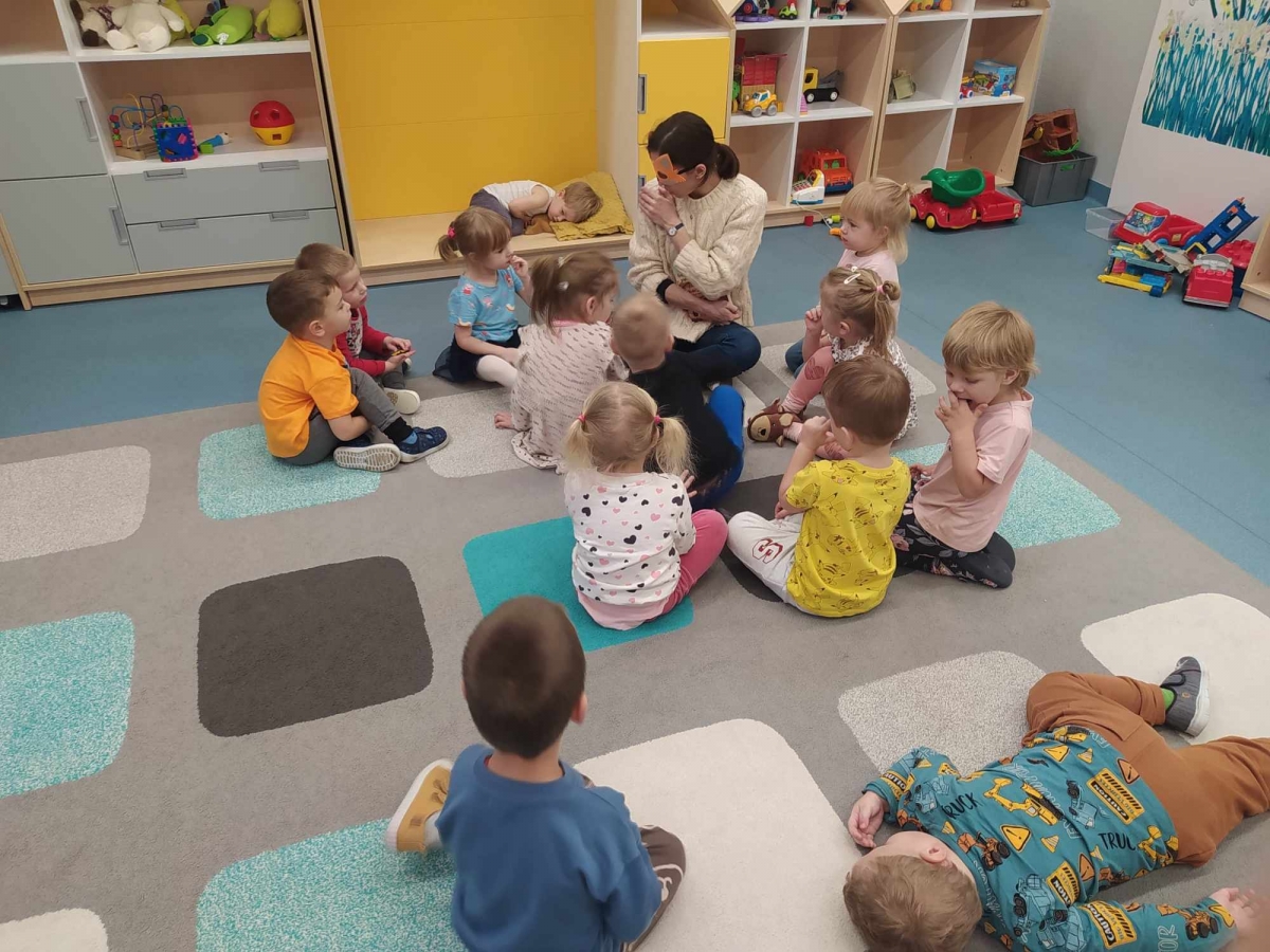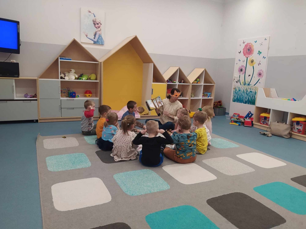 ,,Tam gdzie padła sosna stara mieszka z dziećmi wilków para, wielka jama jest pod sosną, w niej bezpiecznie wilczki rosną.”  – brzmiały słowa przeczytanej bajki. Wśród jej bohaterów znalazły się lis, kret, niedźwiedź, wiewiórka, ryba i niedźwiedź. Szczególną uwagę zwrócił ostatnich z nich! Na koniec spotkania cała grupa zaśpiewała piosenkę o czytaniu książek, naśladując z radością różne gesty, ruchy wskazując na poszczególne części ciała, które opisywała treść piosenki.