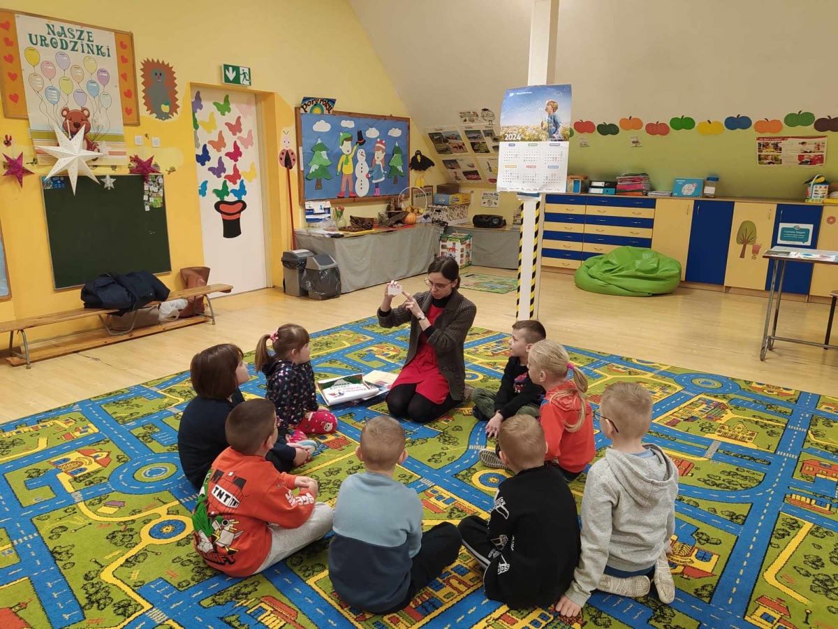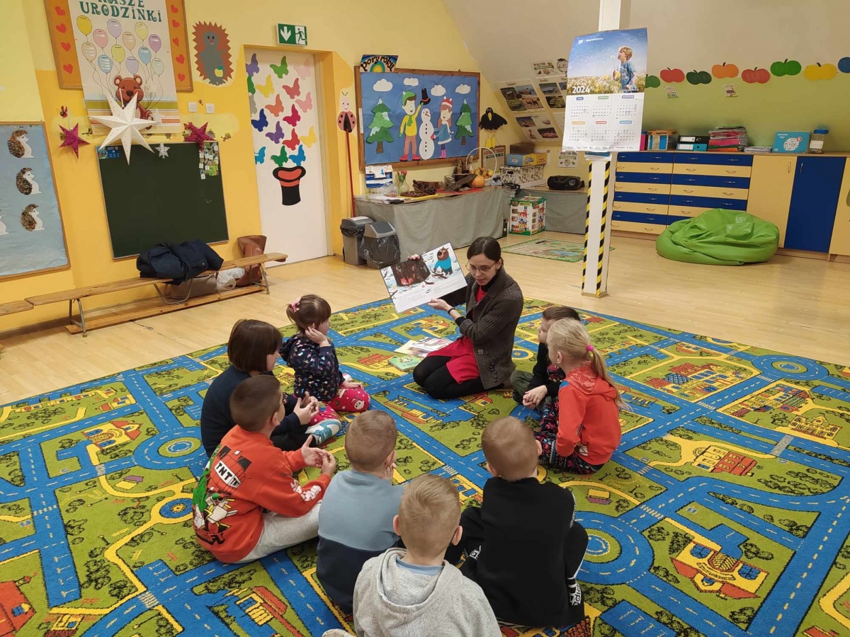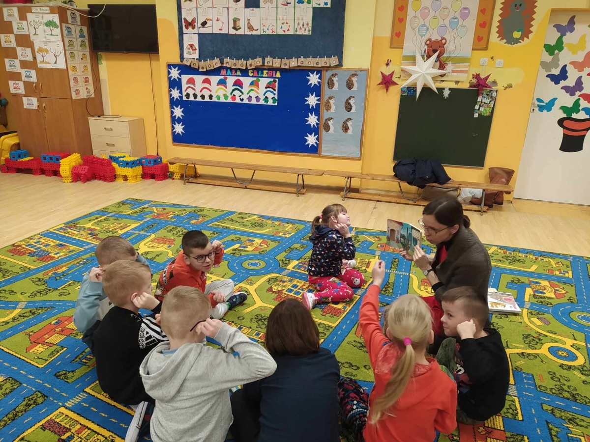 ,,Pokażcie gdzie są wasze uszy.” – poprosiła bibliotekarka w drugiej części zajęć i zachęciła, by dzieci ,,mocno je nadstawiły” do słuchania kolejnej książki o pięknych ilustracjach pt. ,,Edzio i świąteczni goście” autorstwa A. Desbordes. ,,Niedobrze, żeby w Święta ktokolwiek był sam. Podobnie jak w wysłuchanej przed chwilą przez was historii o Edziu, który szukał schronienia (na szczęście je znalazł!) w Boże Narodzenie, byłoby wspaniale żebyśmy my również spędzili ten czas w rodzinnej atmosferze, w cieple naszych domów, niektórzy może ulepią bałwana lub ubiorą choinkę.” – dodała. Ponadto życzyła wszystkim dzieciom wielkiej radości z okazji nadchodzących Świąt!