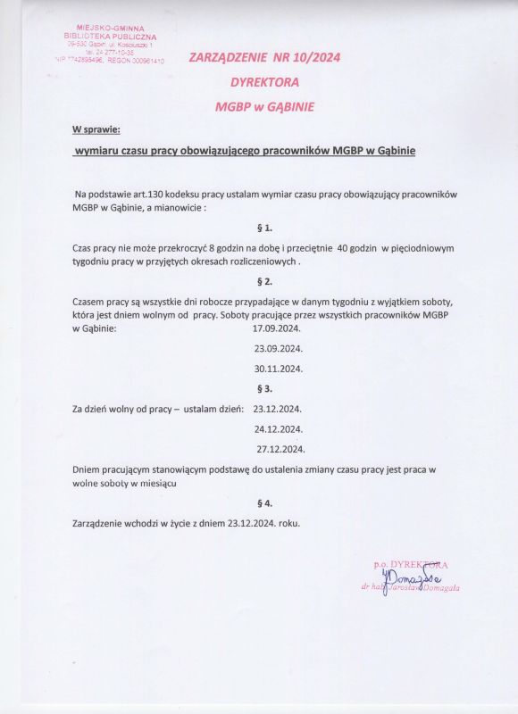 Dokumenty Zarządzenie nr 10/2024 Dyrektora MGBP w Gąbinie 17 grudnia, 2024 Continue Reading Previous Previous post: Uwaga! Ważna informacja! Next Next post: Odwiedziny 58. Gąbińskiego Szczepu Harcerskiego „Gradiam” w MGBP w Gąbinie Dodaj komentarz Anuluj pisanie odpowiedziTwój adres e-mail nie zostanie opublikowany. Wymagane pola są oznaczone *Komentarz * Nazwa * Adres e-mail * Witryna internetowa Zapamiętaj moje dane w tej przeglądarce podczas pisania kolejnych komentarzy.