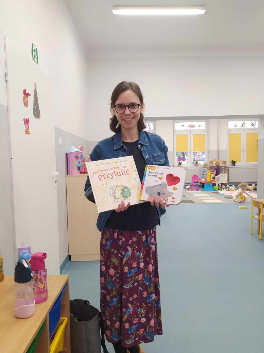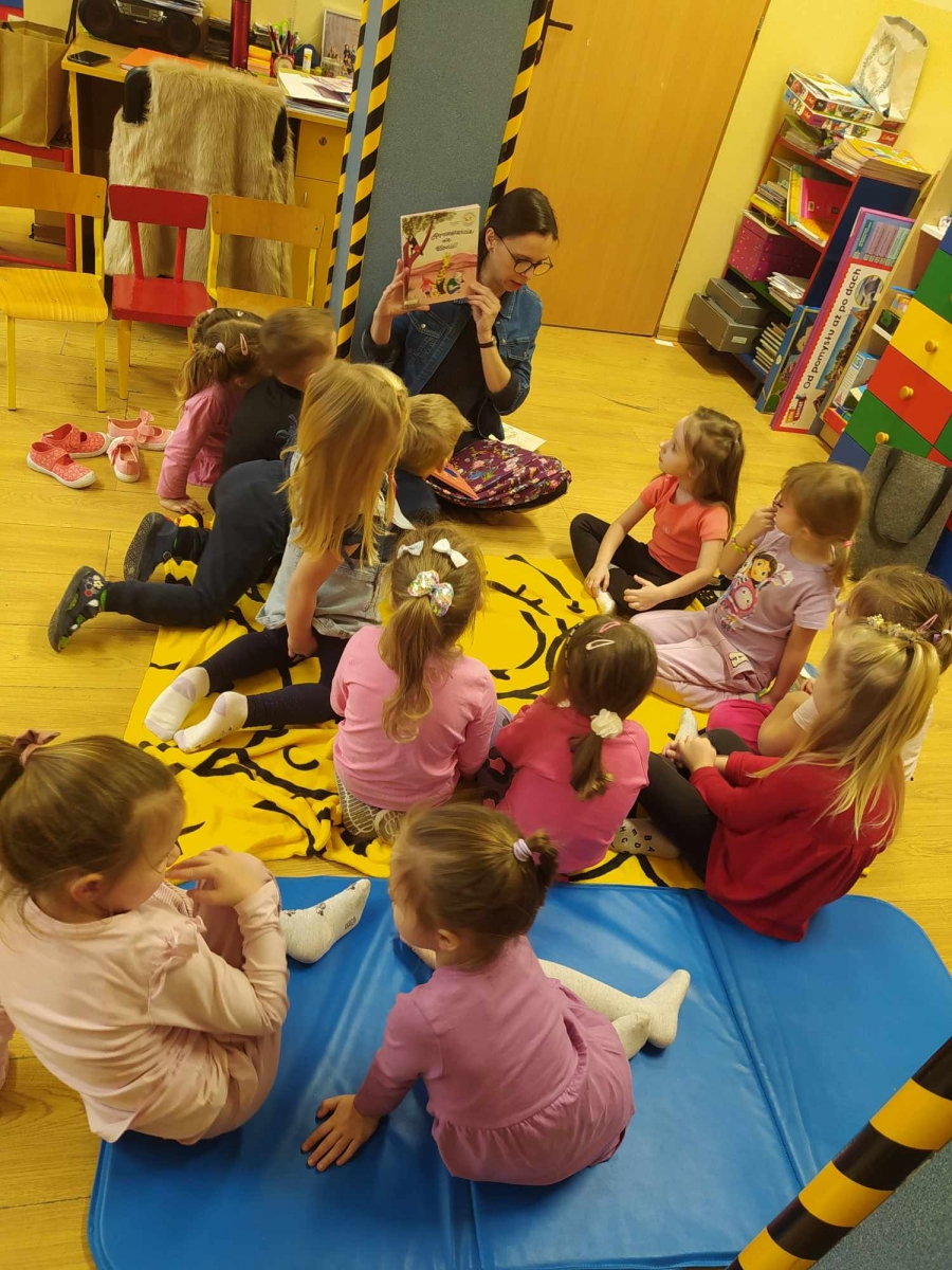,,Gdy moja mama wychodzi do pracy to daję jej całusa albo ją przytulam”, ,,Najbardziej lubię rzucać się na szyję mojemu tacie!”, ,,Osobą, którą chętnie ściskam jest Jagoda, moja koleżanka, siedząca obok” –wyliczały dzieci. Przytulanie jest ważne ponieważ wyraża życzliwość, sympatię, okazujemy przez nie miłość oraz ma moc uspokojenia, gdy dzieje się jakaś krzywda – podkreśliła bibliotekarka Karolina a następnie przeczytała dzieciom książkę pt. ,,Tak bardzo czekam, żeby cię przytulić” Eoin McLaughlin.
