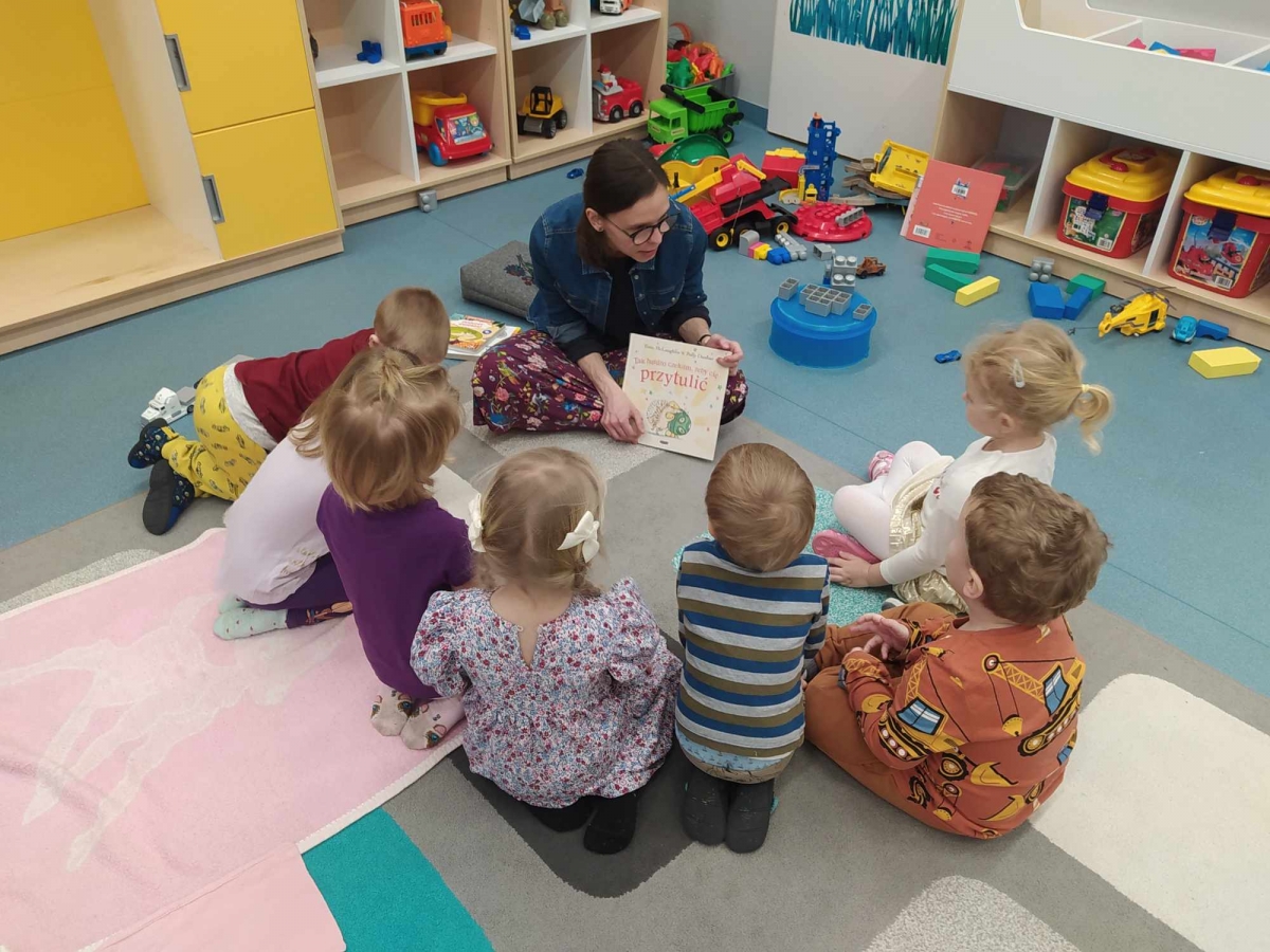 ,,Kto jest pierwszą osobą, jaka przychodzi Wam do głowy, którą chcielibyście przytulić?” – zapytała bibliotekarka – ,,My sami!” – odpowiedziały dzieci podczas dzisiejszego Spotkania z bajką. ,,Smerfy” (tak nazywa się najmłodsza grupa dzieci w przedszkolu, gdzie były prowadzone zajęcia) dzieliły się historiami na temat uścisków.