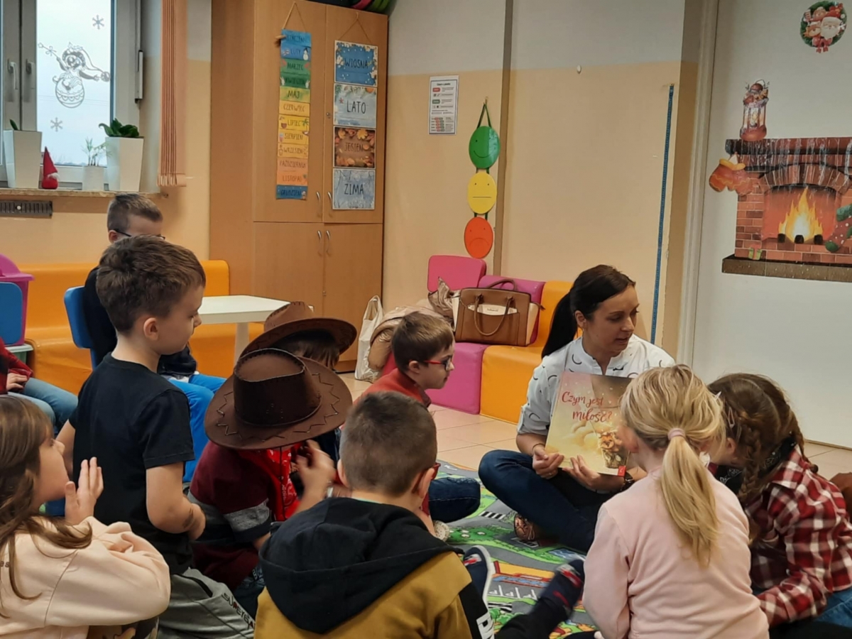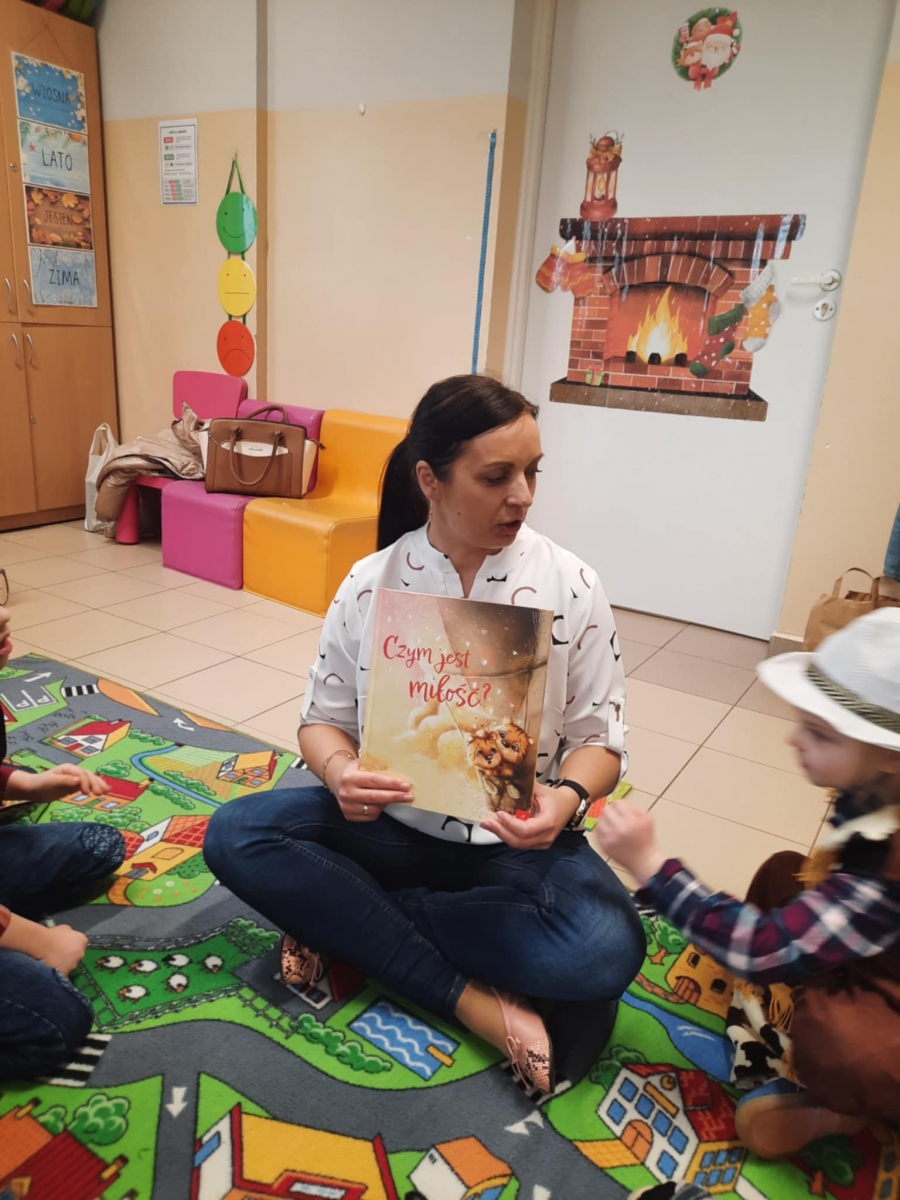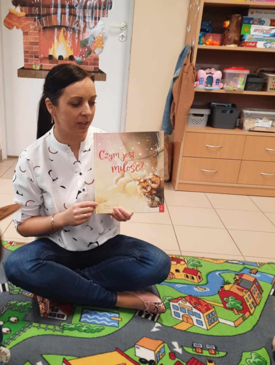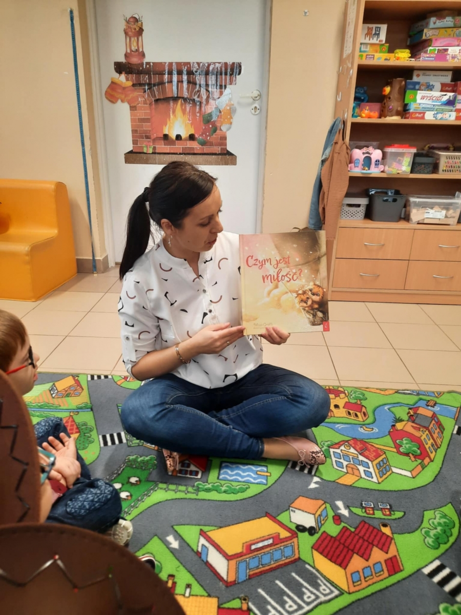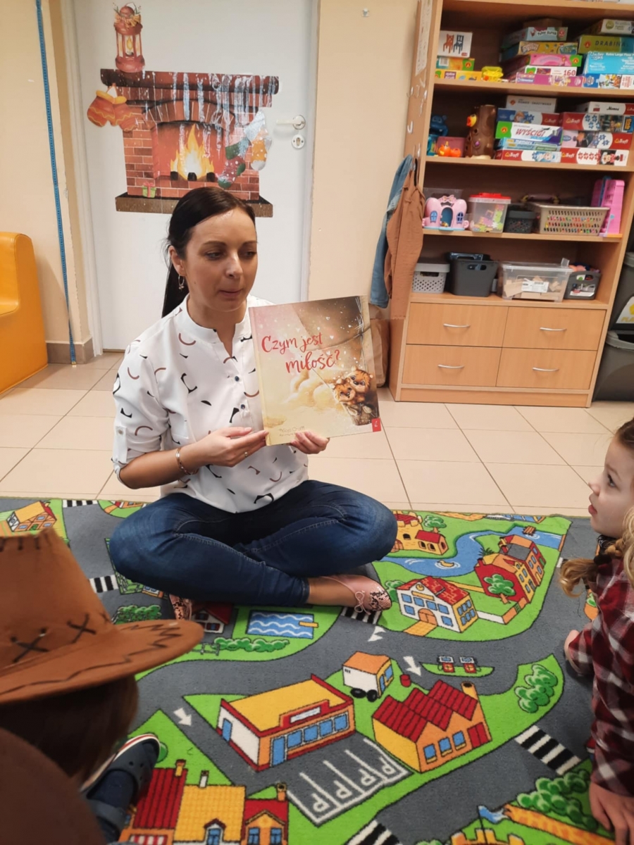 Uroczym słuchaczom przeczytałam książkę Mojo Graffi pt. „Czy jest miłość”, gdzie główny bohater- mały tygrys próbował znaleźć odpowiedzi na pytania dotyczące uczucia- miłości.  Czy można ją usłyszeć? Gdzie jej szukać? Czy miłość ma jakiś kolor? Czy jest duża czy taż mała? Czy ma jakiś kształt?