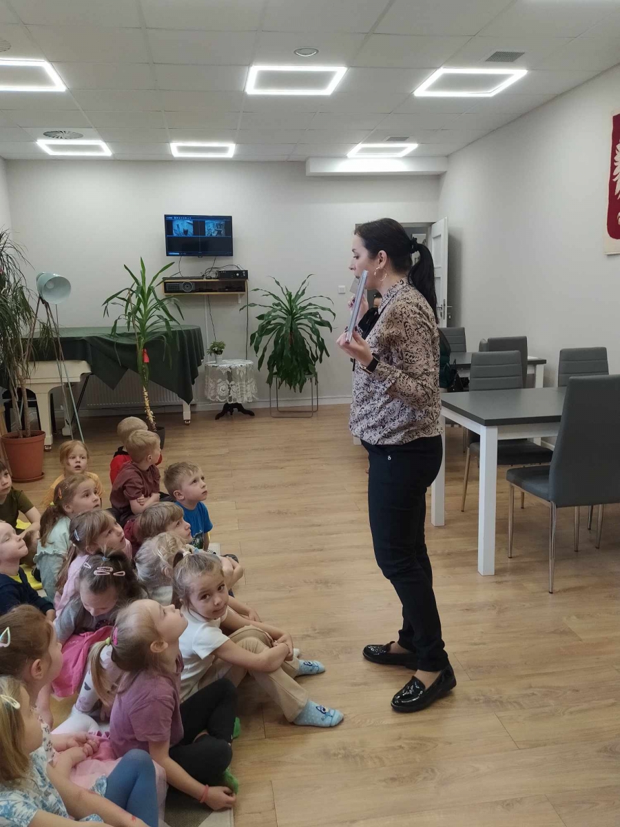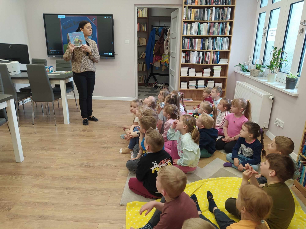 Na początku spotkania gr. Skrzatów została mile przywitana przez bibliotekarkę Joannę, która przypomniała im o akcji pod hasłem ,,Mała książka-wielki człowiek” Instytutu Książki w Krakowie. Dzieci, które wezmą w niej udział zupełnie bezpłatnie otrzymają książki, broszurkę dla rodziców lub opiekunów o sposobach czytania oraz specjalną kartę do zbierania naklejek. Skrzaty bardzo się cieszyły, że miały okazję odwiedzić bibliotekę, tym bardziej, że dla niektórych było ich to pierwsze spotkanie z tak dużą ilością książek w jednym miejscu.