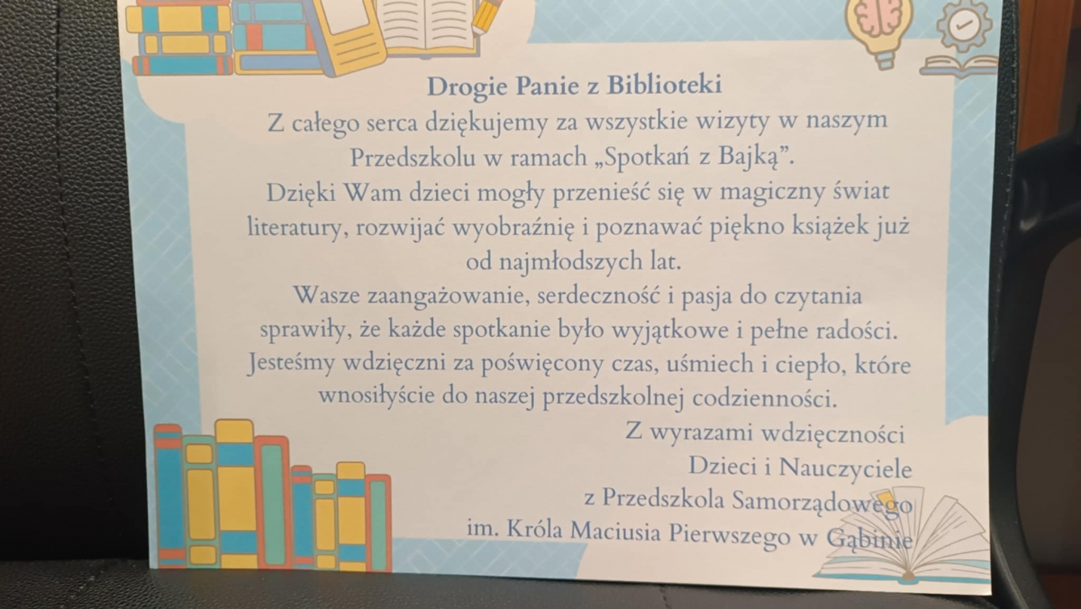 Galeria Zakończenie „Spotkań z bajką” w Przedszkolu w Gąbinie- podziękowania 25 czerwca, 2025 Continue Reading Previous Previous post: Lekcja biblioteczna z klasą I ze Szkoły Podstawowej w Gąbinie (09.06.2025) Next Next post: Uwaga! Ważna informacja! Dodaj komentarz Anuluj pisanie odpowiedziTwój adres e-mail nie zostanie opublikowany. Wymagane pola są oznaczone *Komentarz * Nazwa * Adres e-mail * Witryna internetowa Zapamiętaj moje dane w tej przeglądarce podczas pisania kolejnych komentarzy.