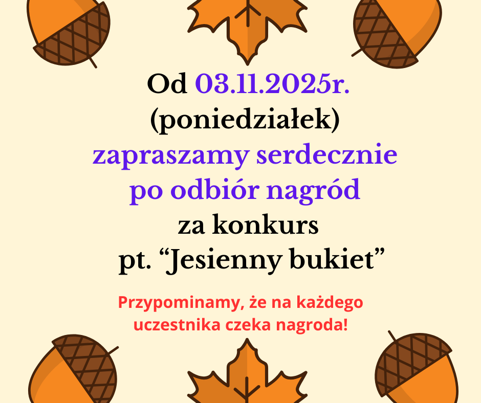 Main Odbiór nagród za konkurs pt. „Jesienny bukiet” 3 listopada, 2025 Continue Reading Previous Previous post: Ważna informacja!Next Next post: Informacja! Dodaj komentarz Anuluj pisanie odpowiedziTwój adres e-mail nie zostanie opublikowany. Wymagane pola są oznaczone *Komentarz * Nazwa * Adres e-mail * Witryna internetowa Zapamiętaj moje dane w tej przeglądarce podczas pisania kolejnych komentarzy.