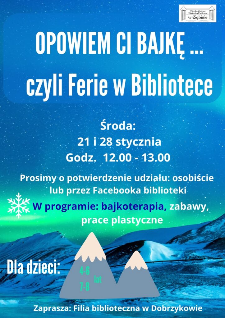 Serdecznie zapraszamy w dwie najbliższe środy (21 i 28 stycznia), w godz. 12.00-13.00 na Ferie do Filii Bibliotecznej w Dobrzykowie pt. ,,Opowiem Ci bajkę…” . Na zajęciach poznamy bliżej termin ,,bajkoterapia”, kreatywne zabawy z wykorzystaniem książek i wykonamy prace plastyczne.
