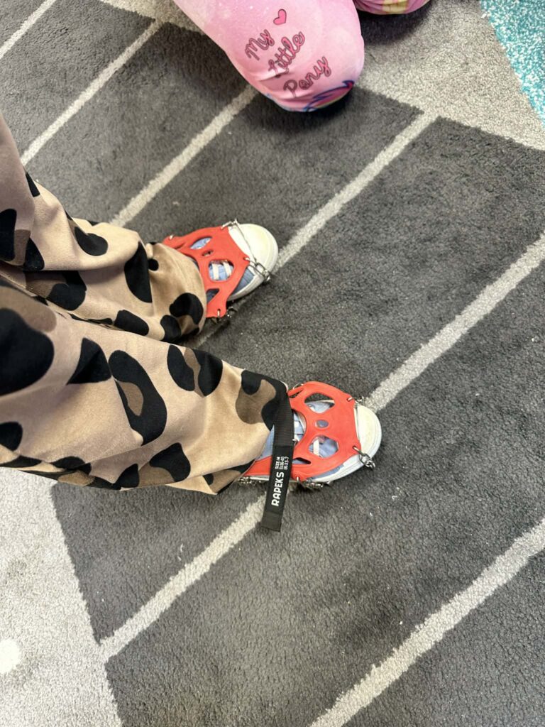 Na koniec spotkania bibliotekarka wyjęła z torby niespodziankę: raczki! Nakładki na buty do chodzenia po oblodzonych powierzchniach. Gadżet, który świetnie sprawdza się w obecnej porze miał jeszcze mocniej zachęcić dzieci do bezpiecznego przeżycia ferii.