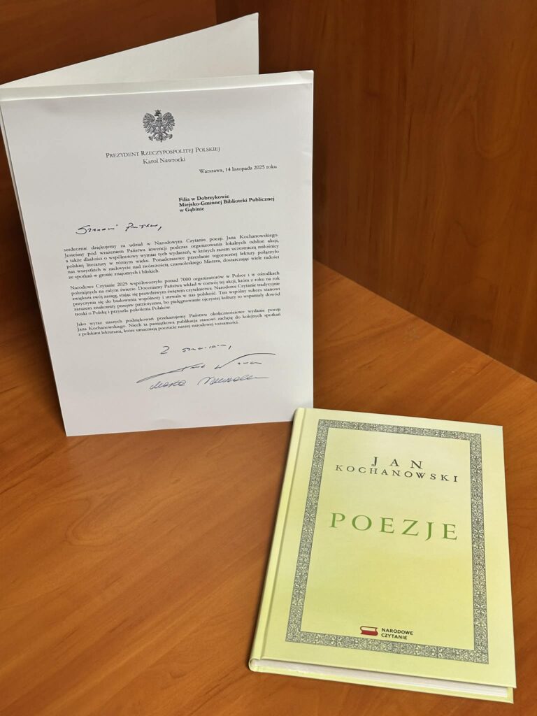Para Prezydencka składa podziękowania Filii Bibliotecznej w Dobrzykowie za udział w kolejnej edycji Narodowego Czytania. Z tej okazji przesłali list gratulacyjny oraz okolicznościowe wydanie poezji Jana Kochanowskiego.