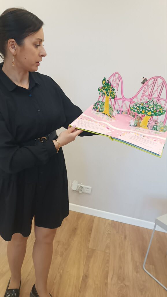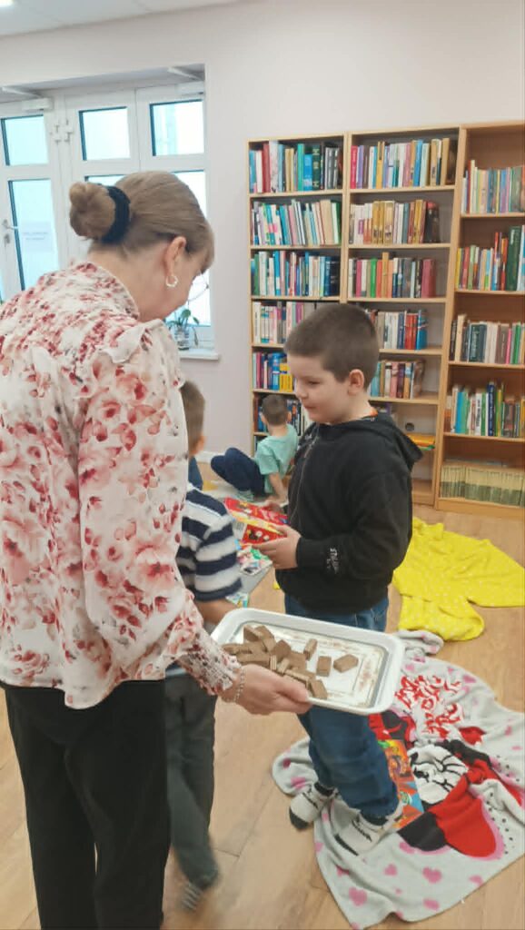 Spotkanie w bibliotece z grupa „Gumisiów” było pełne radości, ciekawości i aktywnego uczestnictwa dzieci. Na samym początku bibliotekarka Asia serdecznie przywitała dzieci i zapoznała z przestrzenią biblioteki. W prosty i zrozumiały sposób wyjaśniła im, czym jest to miejsce, jakie pełni funkcje oraz dlaczego warto z niej korzystać. Szczególną uwagę poświęciła zasadom zapisywania się do biblioteki- dzieci dowiedziały się, kto może zostać czytelnikiem, jak wygląda karta biblioteczna oraz w jaki sposób można wypożyczać książki. Podkreśliła znaczenie szacunku do książek, jak o nie dbać, aby mogły służyć innym czytelnikom.